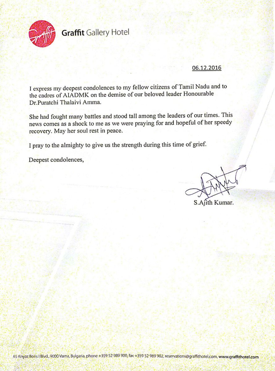 AjithKumar's condolence letter for Jayalalithaa